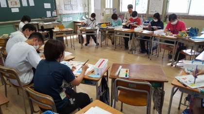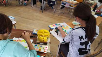 若手教員の研修会を行いました。講師の先生に図画工作科の指導法について学びました。子どもたちと同じように絵の具を使い、改めて表現する楽しさ、むずかしさの両方を感じました。