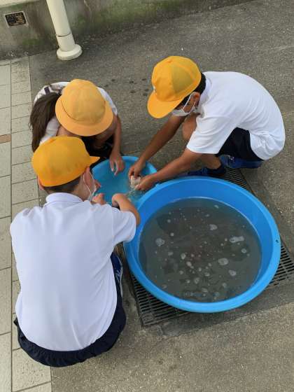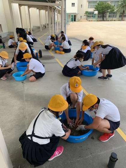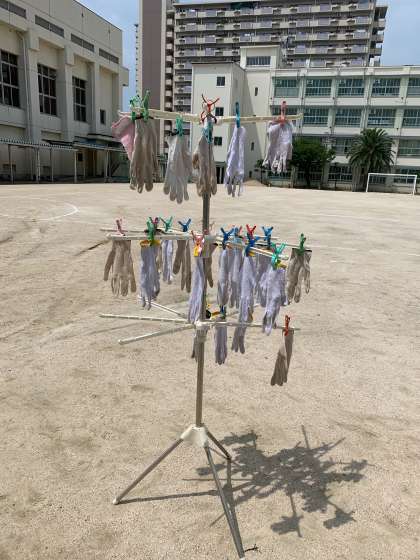 作った洗濯液を大きなたらいに入れて、ゴシゴシと軍手の洗濯をしました。汚れを落としたら、小さなたらいですすぎ。運動場の日当たりがいい場所で干しました。
