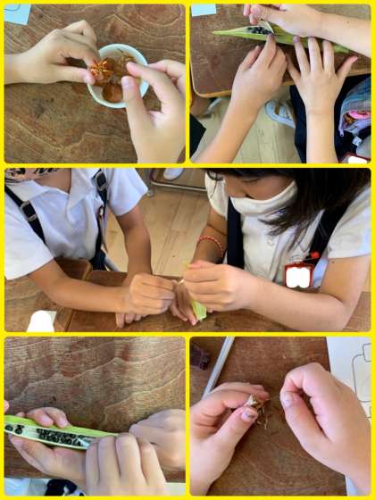 ひまわり、あさがお、ふうせんかずら、おくら…、種の観察が終わったら、まとめて持ち帰ります。ぜひ、おうちでもいろいろな種のちがいを確かめてくださいね。