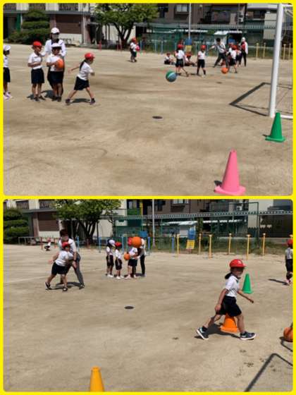 運動場で行いました。ボールを上に投げてキャッチする、ボールをドリブルする、的を狙って投げる、などボールを使った運動に取り組んでいました。