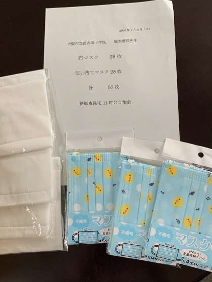 長原東住宅11町会様よりマスクをいただきました。本当にありがたい。マスクそのものももちろん嬉しいのですが、長吉南小学校に通う子どもたちのことを思ってくださる、そのお気持ちが嬉しいです。ありがとうございます。大切に使わせていただきます。