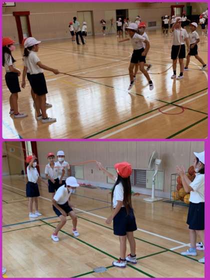 講堂でなわとびをしました。練習の後、グループごとにその練習の成果の発表。跳ぶ人たちは入るタイミングを図る、回す人たちは跳びやすいように大きく回す、チームワークがポイントですね。
