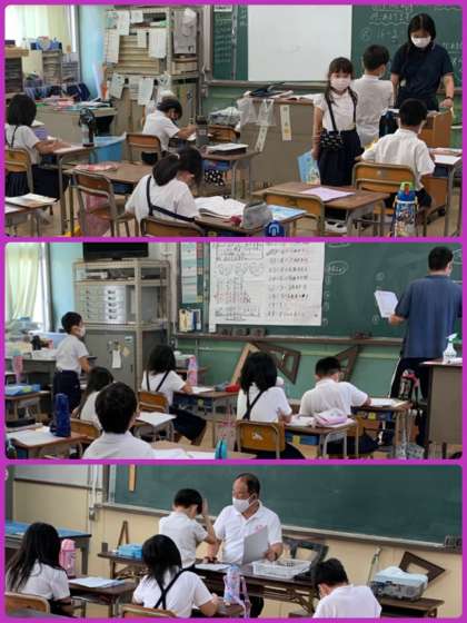 あまりのあるわり算の学習。3クラスに分かれて取り組んでいます。「わかった!」 その後、先生にマルをつけてもらって「やったー!」。間違いを恐れず、どんどんチャレンジして、自信をつけていってほしいです。
