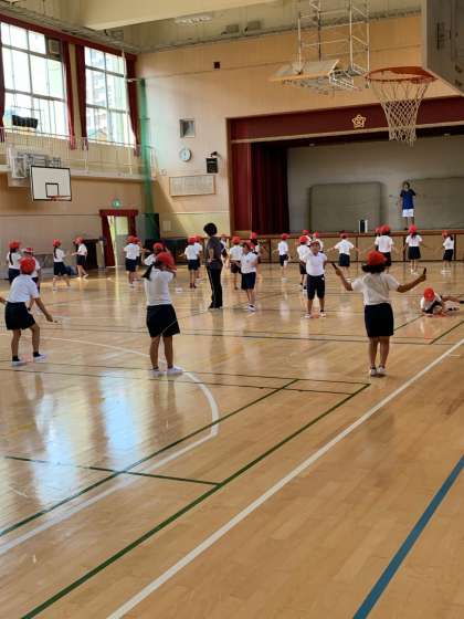 今日の体育は講堂でなわとび。前跳び、後ろ跳びもずいぶん長く跳べるようになっていて、びっくり!子どもの成長はすごいです!