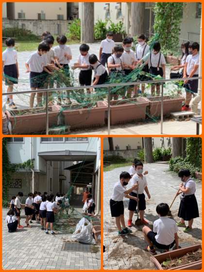 学習も終わり、収穫も終わったヘチマの草取りと片づけをしてくれました。来年もまた、元気なヘチマが育ちますように。