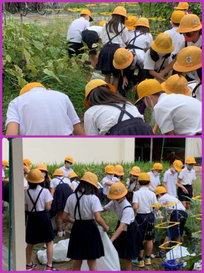 〔1枚目〕3年1組 学習園の雑草抜きをしてくれました。理科で学習したバッタが出て来たり、カボチャや黄色くなったキュウリも発見。あっという間にきれいになりました。ありがとう。