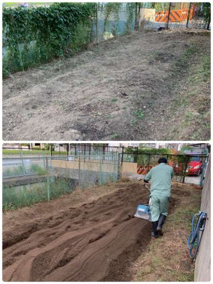 上の写真は、先日、地域の皆様に草抜きをしていただいた後のようすです。暑い中、ありがとうございました。そして下の写真は、本日、長吉中学校の管理作業員さんが耕運機を使い、耕していただいているようすです。立派な畝ができました。ありがとうございます!