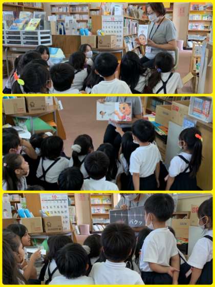 図書館支援員の方に読んでもらっている1年2組の子どもたち。本の世界にどんどん入っていきました。まさにこれが「共感」なのです。