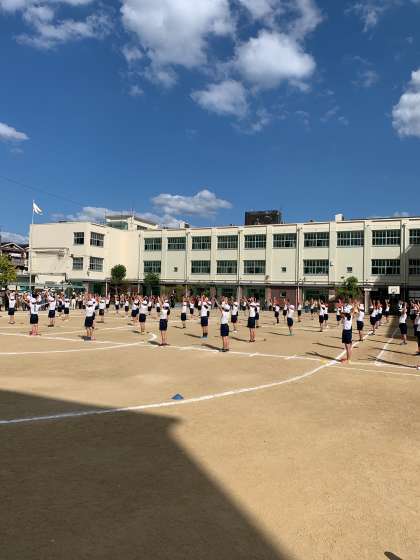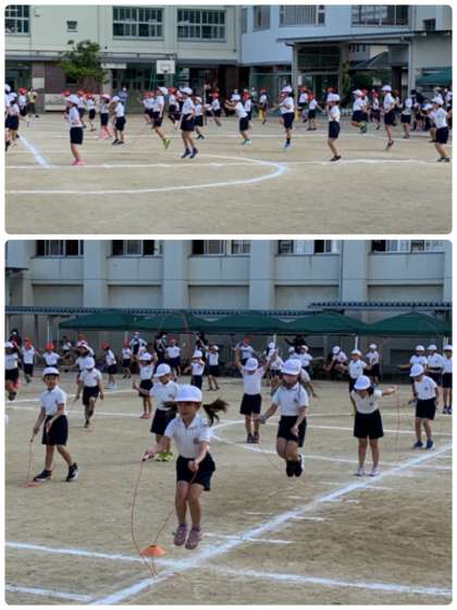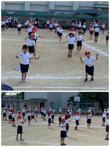 ラジオ体操のあとは、全員で曲に合わせてなわとび。