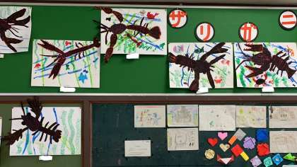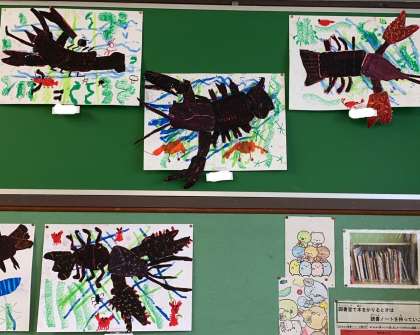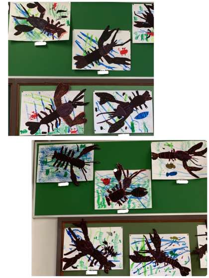 2組のザリガニの作品です。色もしっかり塗りこまれ、画用紙から飛び出る迫力のある作品ばかりです。よくがんばりましたね!