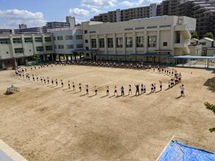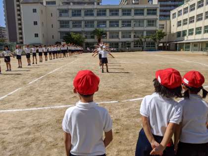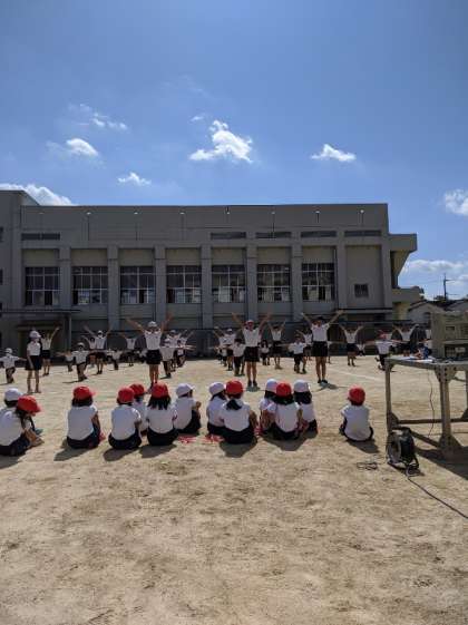 6年生が19日(月)の運動参観で行う団体演技を1年生に披露!