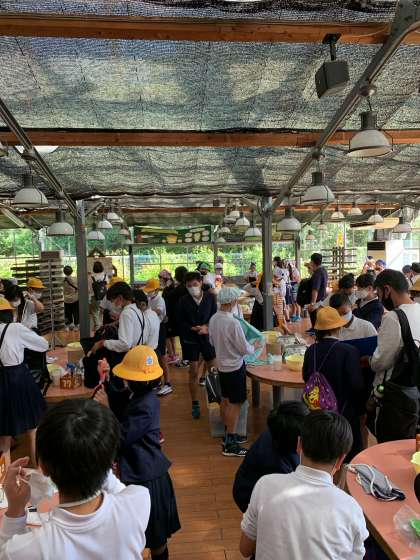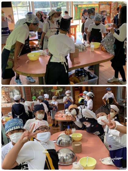 パン作り準備中。家庭科で作ったエプロンを着けています。