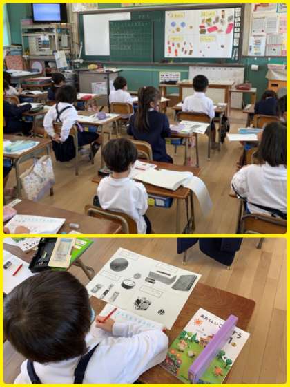 「かたちあそび」の学習。身の回りにはいろいろな形があります。それぞれの形の特徴をとらえる学習です。今日は、形の種類ごとに分類しました。一人一人がもらったカードを「どの仲間かな」と考えて、黒板にピタリ。よくできていました。