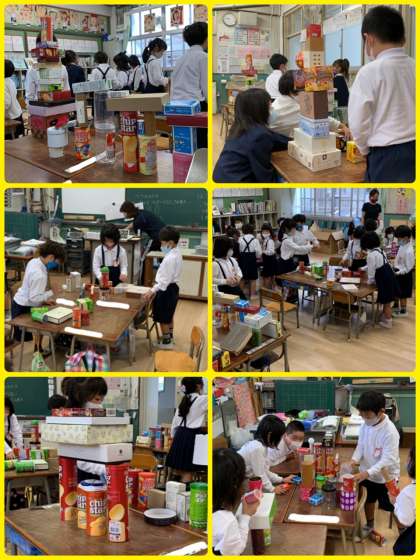 算数「かたちあそび」の学習。おうちから持ってきた箱を使って、グループでいろいろなものを作っていました。箱を横に縦に並べたりしながら、想像力をふくらませます。