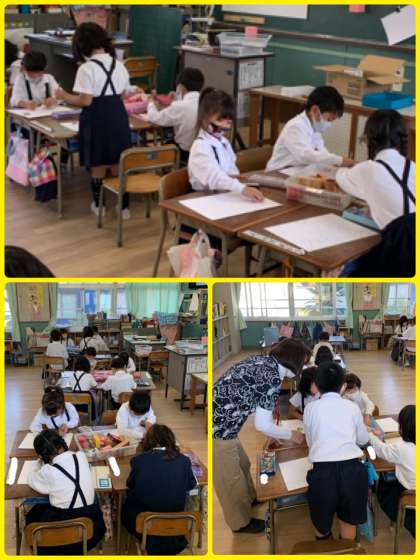 算数「かたちあそび」の学習。今日は「かたちをうつして えをかこう」を学習のめあてに取り組みました。