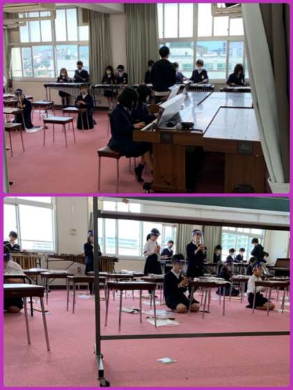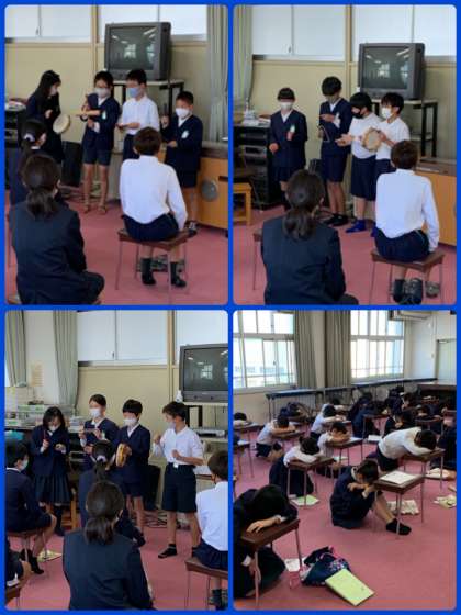 6年生は、各グループで「リズムアンサンブル」をつくり、発表していました。楽しそうに演奏する姿、よかったです。なお、右下の写真は全員叱られてがっくりしているわけではなく、どのグループがよかったかを決める挙手前のようすです。プライバシー保護のため、挙手前に撮影しました。お間違えのないように。
