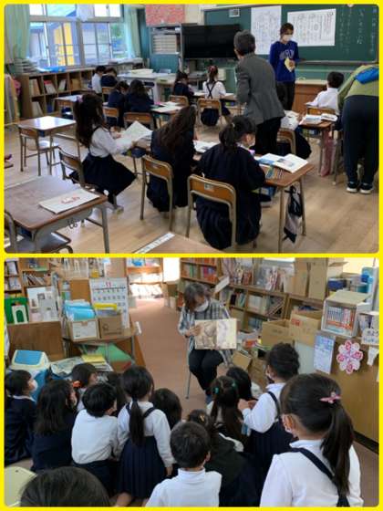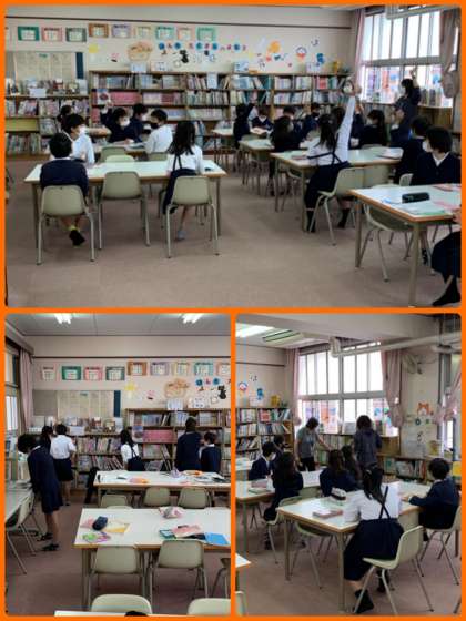 図書館補助員さんが来てくださる金曜日。4年生は国語科の学習でそれぞれが決めたテーマに関する本がどこにあるか、尋ねていました。1年生は今日も読み聞かせをしてもらいました。身を乗り出して本の世界に全集中です!