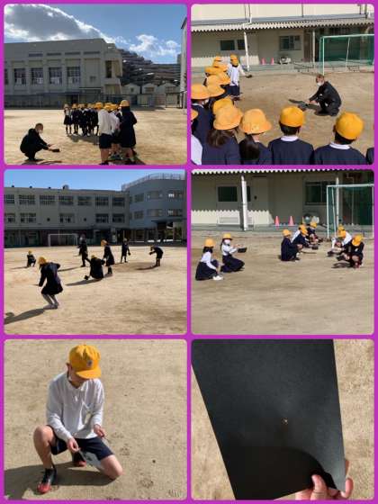 「光のせいしつ」の学習。虫眼鏡と黒い画用紙を持って運動場に来た2組の子どもたち。今日は「虫眼鏡で日光を集めると、どうなるのだろうか」をめあてに学習をしていました。まずは、先生が模範実験。すると、早くも煙が。「うおー」、子どもたちもびっくりな様子。