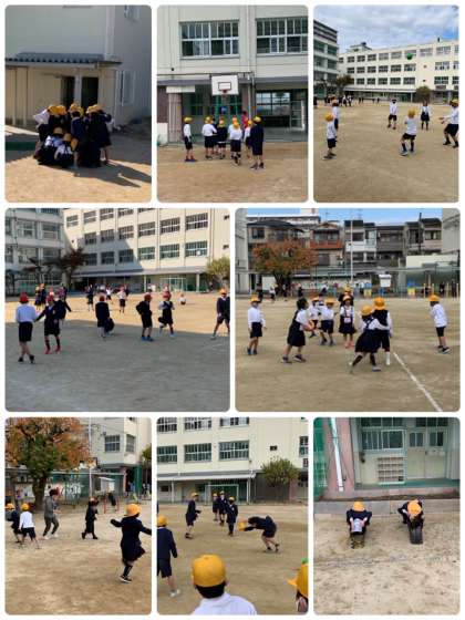 赤帽をかぶった6年2組の子どもたち。何を始めるのかと思いきや「だるまさんがころんだ」。ん〜、楽しそう。アオハルです。