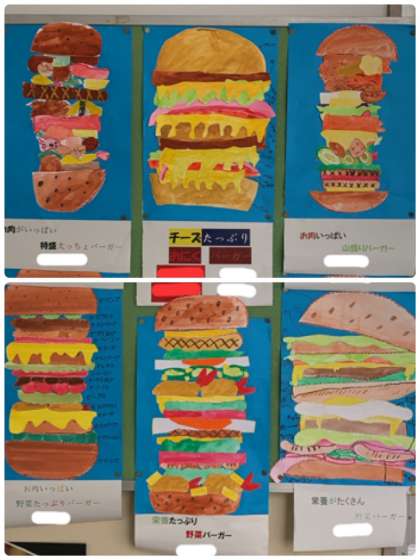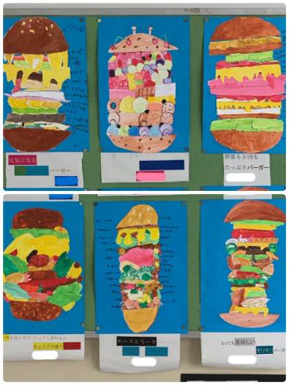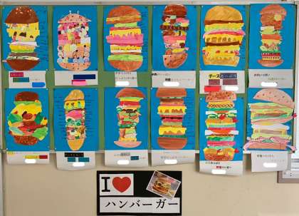 3年生が図画工作で取り組んでいた「I❤ハンバーガー」が完成しました。作品をよく見ると、一人一人が挟みたい具材がいっぱい!美味しそうなハンバーガーばかりです!