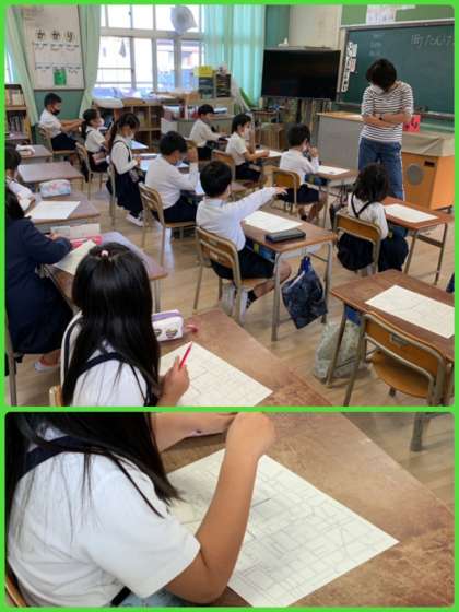 1組 町たんけんに向けて 地域の白地図を使って学習しました。