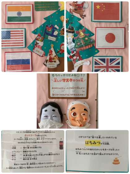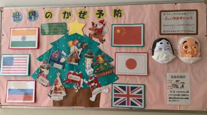 『世界のかぜ予防』12月の保健室前掲示板です。日本を含めた6つの国それぞれのかぜ予防がわかります。ツリーのオーナメントにもかぜ予防の秘訣が!ぜひめくってくださいね。おかめさんとひょっとこさんのマスクの正しい付け方の紹介も。みんなで予防しましょう!