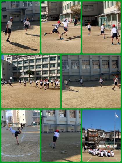 5年生の体育。今日は久しぶりに運動場で行いました。まずは、寒さに負けじと全力で「おにごっこ」。5年生ともなると足も速く、迫力満点です。後半は、ソフトボール投げ。なかなかの記録が出ていました。すばらしい!