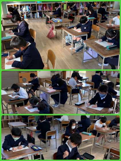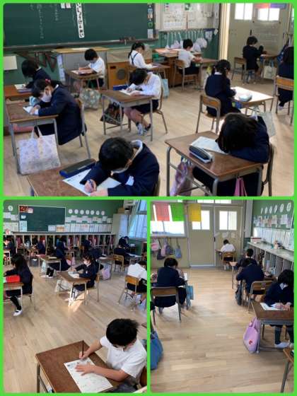 一画一画、ていねいに書く子どもたち。それだけでも気持ちが伝わってきます。うれしいです。わからない漢字があった人は、「ざんねん」で終わらず、もう一度教科書やドリルを見て思い出してほしいと思います。