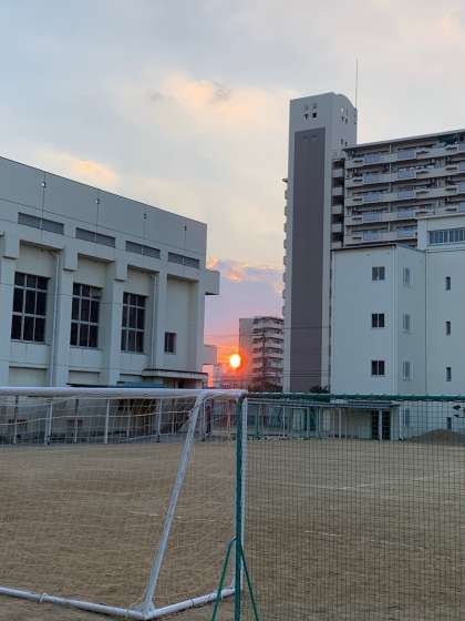 この時期だけだと思いますが、沈んでいく夕日が校長室からちょうど見えます。空気が澄んでいるからか、燃えるような夕日です。まるで子どもたちの背中を押してくれるような夕日。