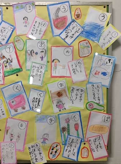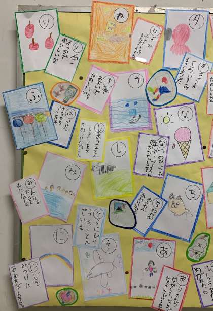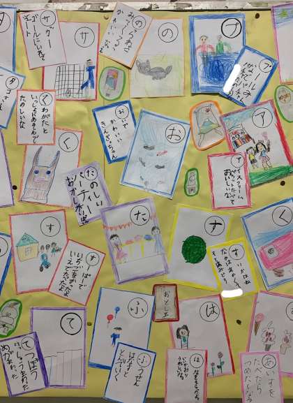 玄関掲示のほかに階段にも、手作りカルタを掲示しています。ぜひご覧ください。