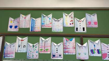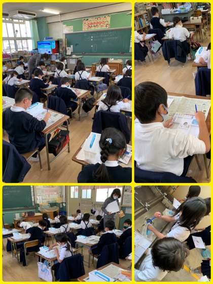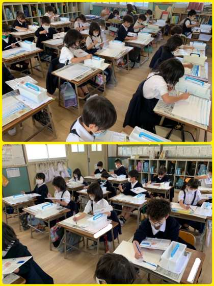 1組の子どもたちが「はじめてのえのぐ」にチャレンジしました。ふで、パレット、ひっせんバケツ、そしてえのぐ。筆洗に入れる水の量、パレットの部屋の意味、絵の具の出し方、筆の使い方…、これから6年間にたくさん使う絵の具セットの第一歩です。大切に使っていきましょうね。思い出に残る作品ができあがりました。