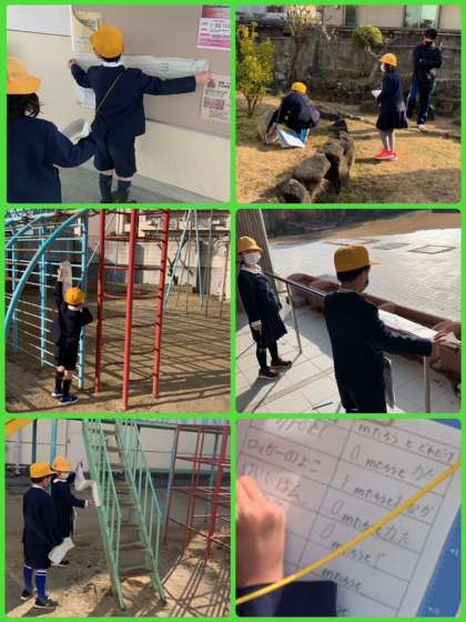 それぞれが自分の「メートルたろう」さんを、持って、校内にあるいろいろなものを測っていました。だいたいの1mの長さはわかったかな?