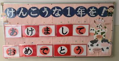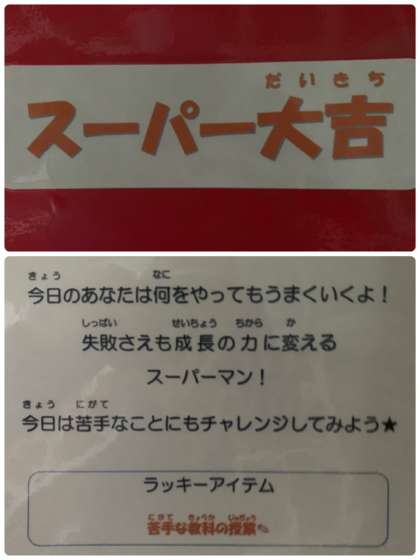 保健室の掲示板です。「あけましておめでとう」この10文字がおみくじになっています。中には、このように「スーパー大吉」も!みなさんはどうだったかな?
