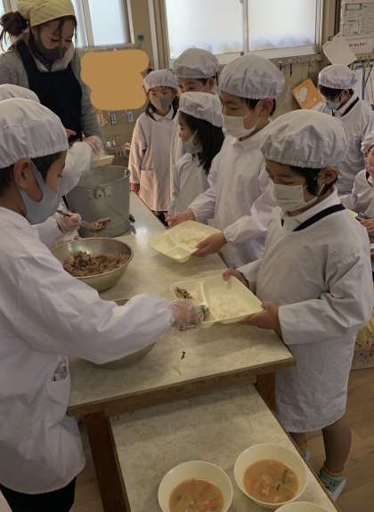 2年生に向けて、給食の配膳も始めました。がんばっています!