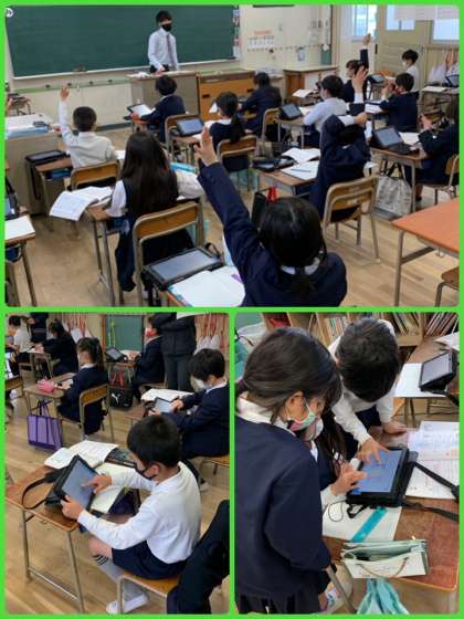 タブレット端末を使って、「4けたの数」に取り組んでいました。百の位の数が10こになったら、どうすればいいのか、みんなで考えました。集中して取り組んでいました。