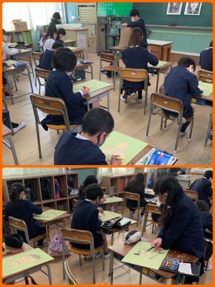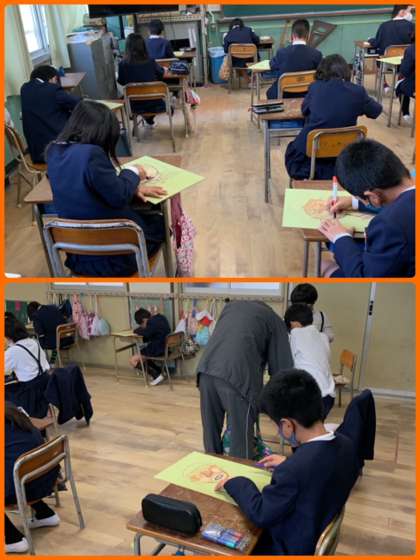 自画像の木版画に取り組んでいます。彫る向きや彫る深さによっても印象が変わる木版画。どんなふうにできあがるのか想像しながら、子どもたちが頑張る姿を見ていました。根気強く最後までがんばってほしいです。