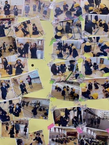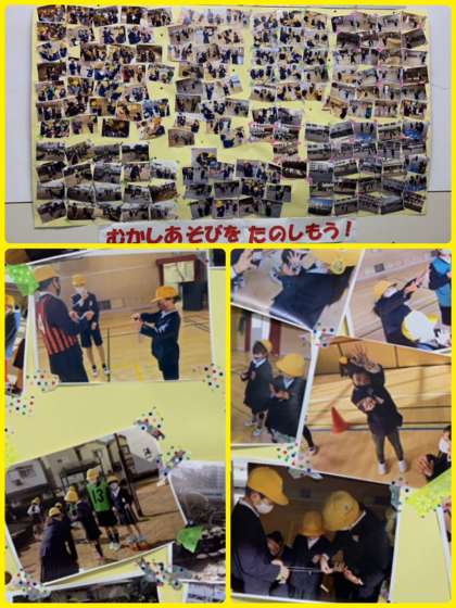 先日の6年生との「むかしあそびをたのしもう!」。その際に撮影された写真がたくさん掲示されています。みんな、いい顔しています!