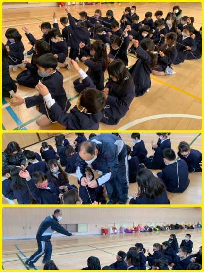 1年生は、教務主任の先生をゲストにお招きして「こままわし」に取り組みました。うまく回せたかなぁ。