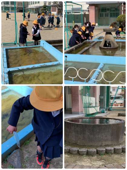 職員室前にある池も凍っていました。そちらも「うわー!」と指でツンツンする子どもたちです。