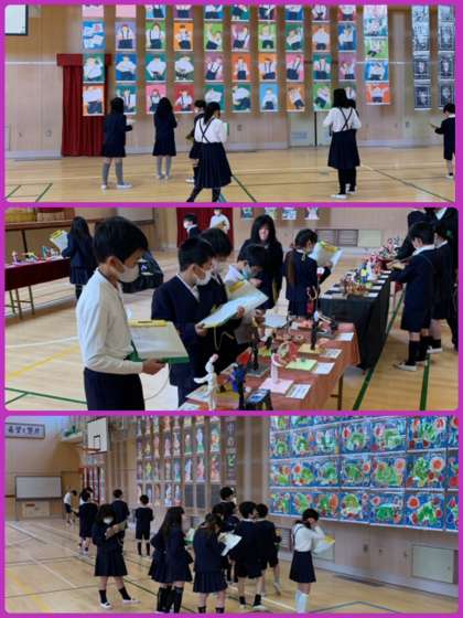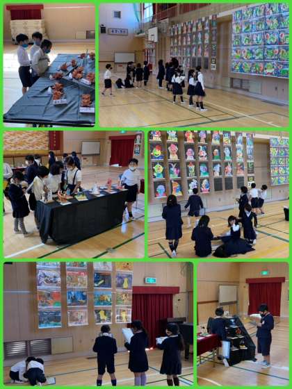 今日、そして明日は、子どもたちによる作品鑑賞の時間です。「これ見て、おもしろい」「あっ!○○さんのおねえちゃんの絵や!」「これ、めっちゃきれい!」、うれしい言葉がたくさん聞こえてきました。