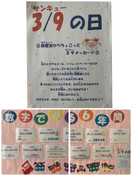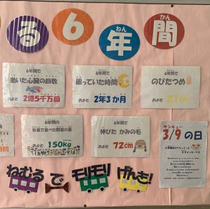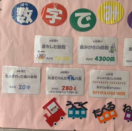 もうすぐ卒業する6年生に養護教諭が作成した「数字でみる6年間」が掲示されています。読んでくれましたか?