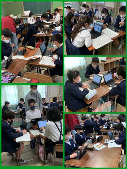 タブレット端末を使って学習に取り組む5年生。