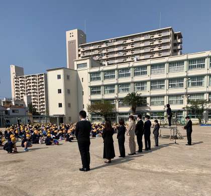 まずは着任式。新しく来られた教職員一人一人から、子どもたちへ「よろしく」のあいさつが。そして、子どもたちからは「ようこそ」の大きな拍手が。温かい雰囲気に包まれました。