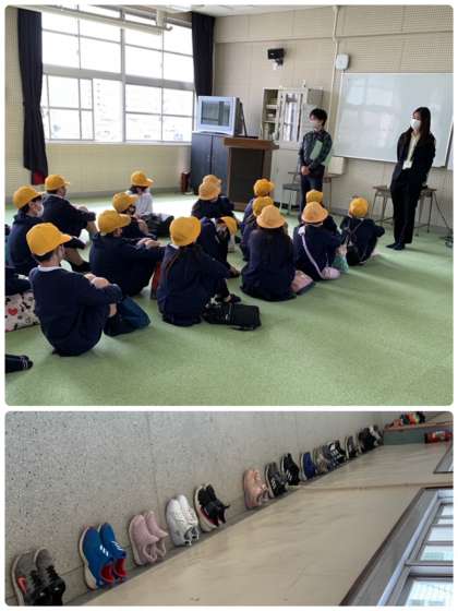 6年生は小ホールで。さすがは、最高学年。靴がそろっています!