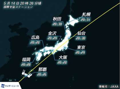 JAXA(宇宙航空研究開発機構)によると、宇宙飛行士の星出彰彦さんが滞在する国際宇宙ステーション(ISS)/きぼうが、今日5月14日(金)20時半頃に日本付近を通過します。