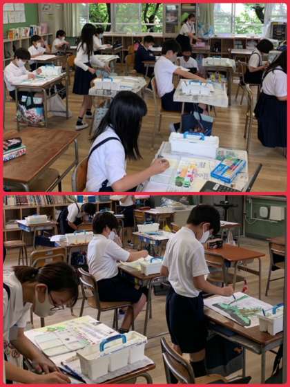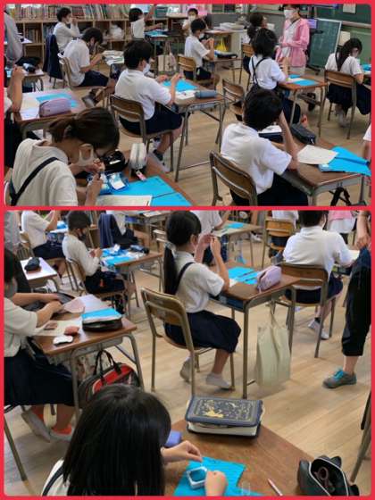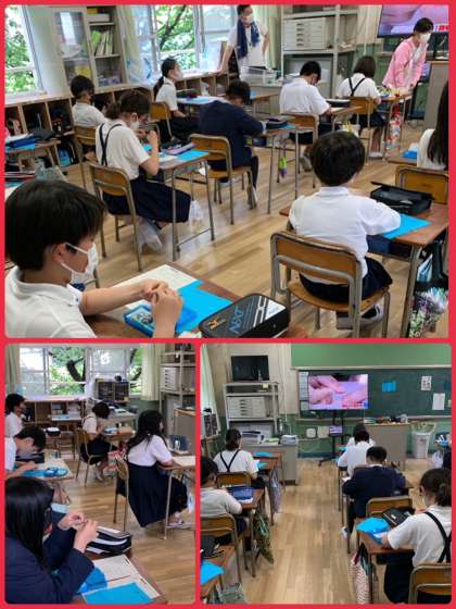 裁縫道具デビューしました!!初めての経験です。焦らず、ゆっくりとすすめていきます。針などを落とすと危ないです。なくならないように名前を書くことと終わった後は落としていないか、必ず点検しましょう。道具を忘れてしまうと何もできませんので、家庭科の時間は忘れないように。