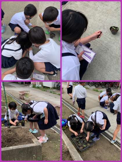 聴力検査のあと、2組の子どもたちは学習園の観察に。