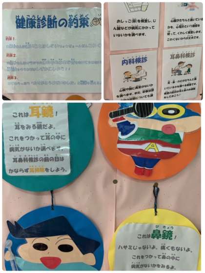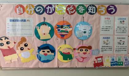 保健室前の掲示板です。5月から6月にかけて実施予定の検診内容が掲示されています。検診内容ももちろんですが、そこにも書かれていますように、子どもたちには『自分のからだ』にぜひ関心をもってほしいです。