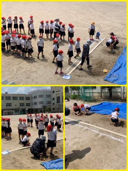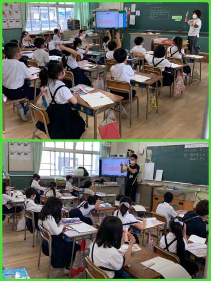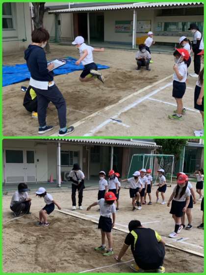 今日は1・2年生が「立ち幅跳び」にチャレンジ!腕を振ったり、膝を曲げ伸ばしして、その反動で大きくJUMP! タイミングよく跳べたかな?おうちでも聞いてあげてください。