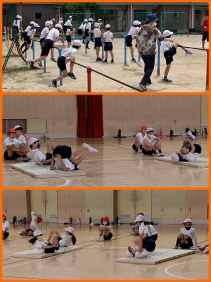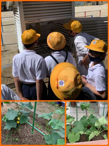 2組理科の学習。百葉箱を見に来ていました。中に何があったか、わかりましたか? ヘチマもひょうたんもどんどん伸びてきています。楽しみですね。